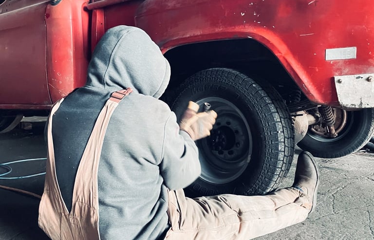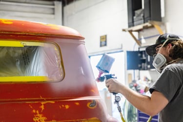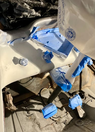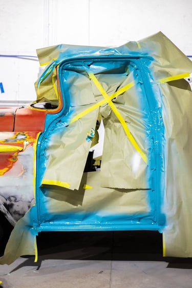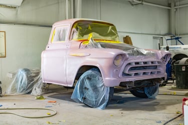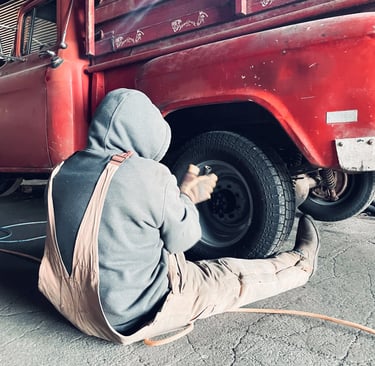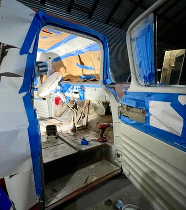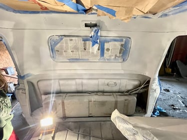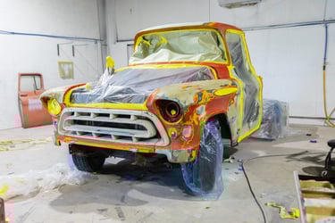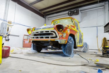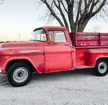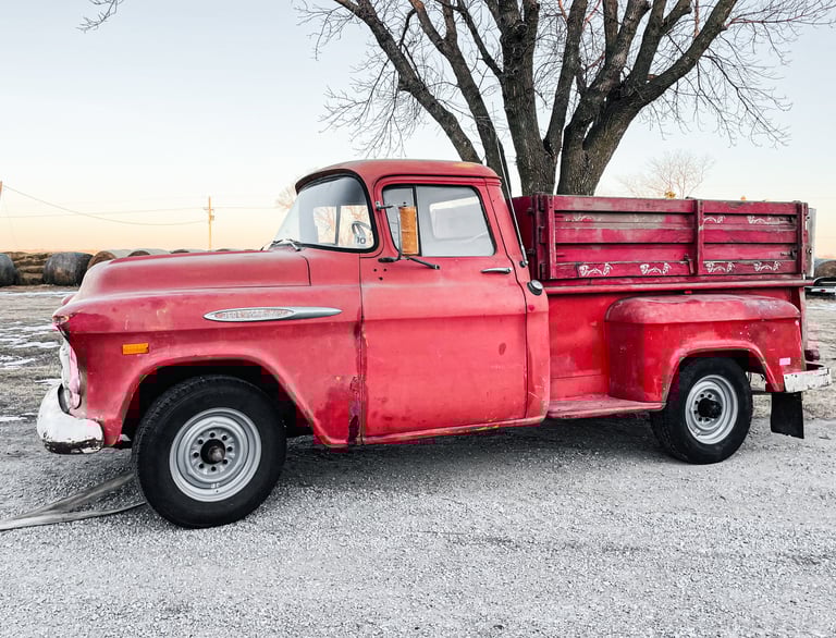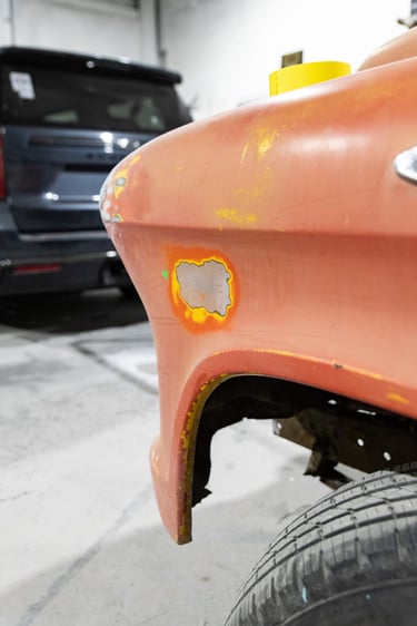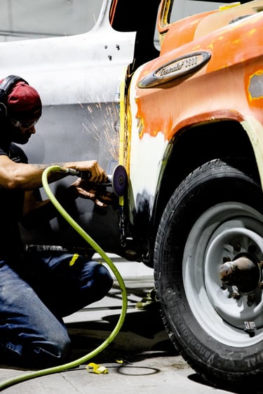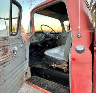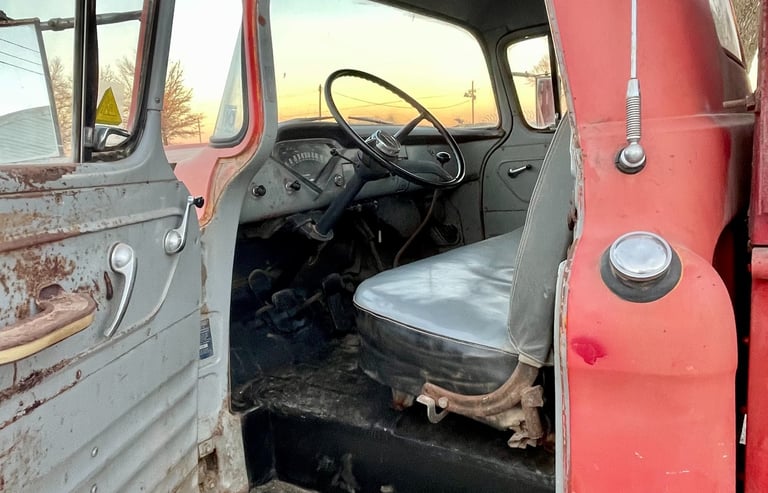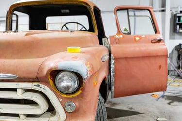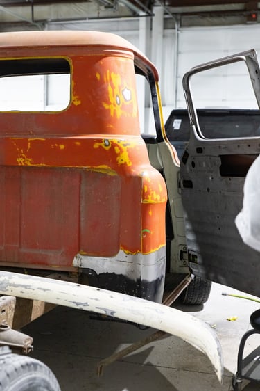If you can imagine, a 65+ year old pickup (that was found in a shed with no roof) had a few dings in her. In fact, Abby still has the text on her phone from the day Dustin started to work on the roof of Pat that said, "It's almost like a tree fell on it, they patched it, but forgot to take the tree out first". Abby was the CSO of this project -- Chief Sanding Officer. Needless to say, if it weren't for Dustin, Alex, our paint master, and Alex's family (his grandpa found us a new door and dad, Tim, was found at the shop from time to time) Pat wouldn't look like she does today.