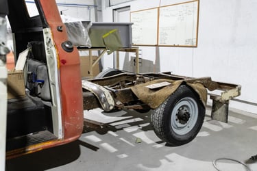 PAT HASN'T ALWAYS BEEN HER SIGNATURE BLUE. IN FACT, SHE WAS ORIGINALLY SCHOOL BUS YELLOW PROBABLY OWNED BY THE COUNTY GOVERNMENT. PAT WAS NO DOUBT A WORK HORSE, BUT SHE'S READY TO SERVE IN A DIFFERENT WAY